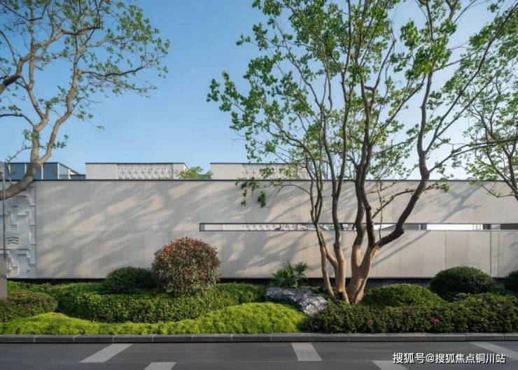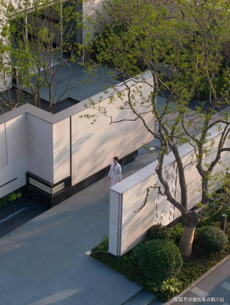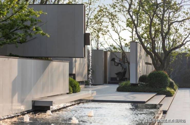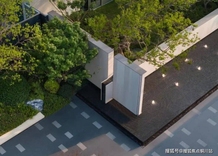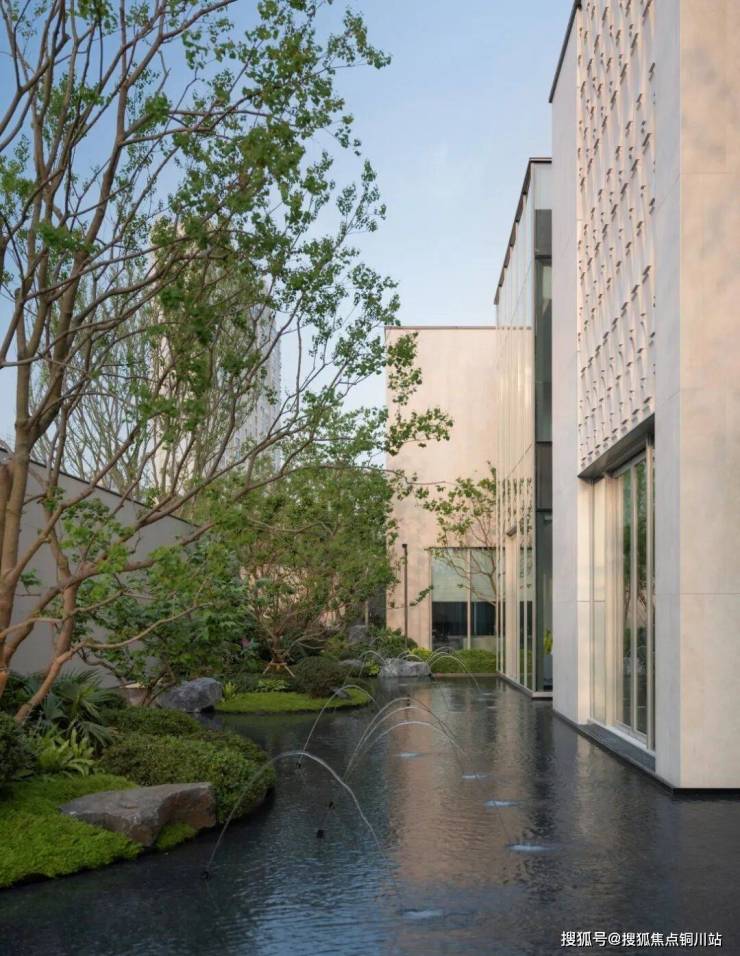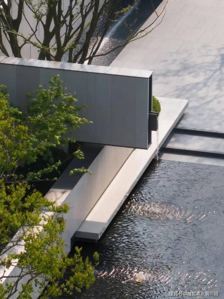 疏林掩映间,一泓泉水从高处跌落在水台之上,定制的99根铜质喷头编织出优雅的弧形,寓意长长久久,水流缓缓落下,渐入山门的秩序之感迎面而来。