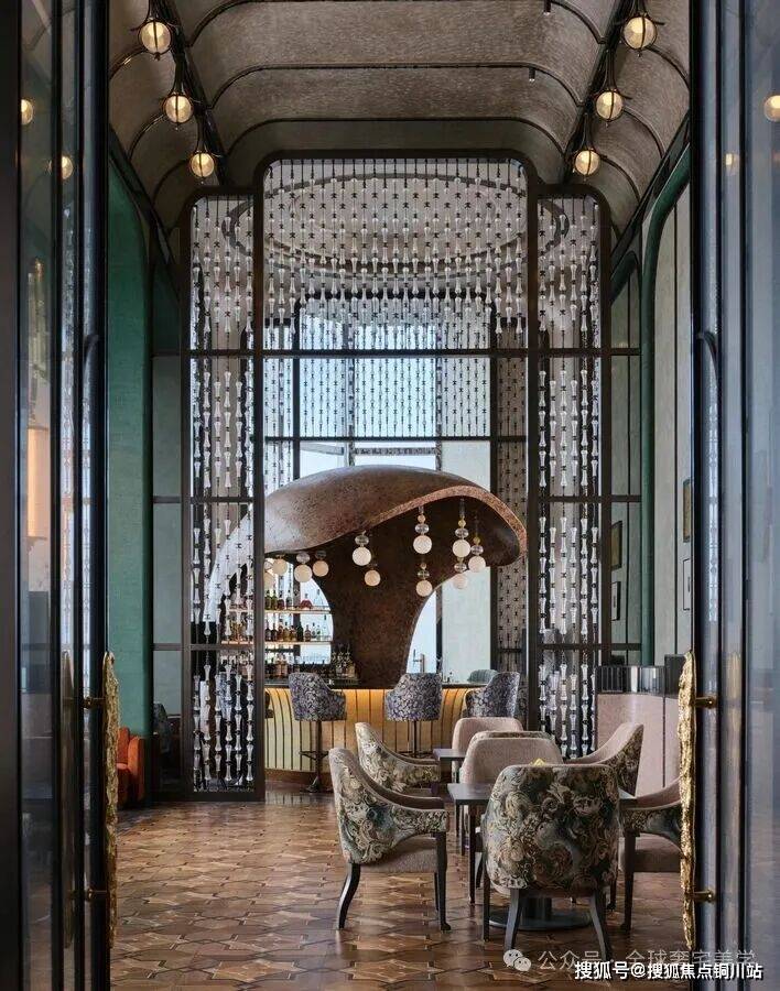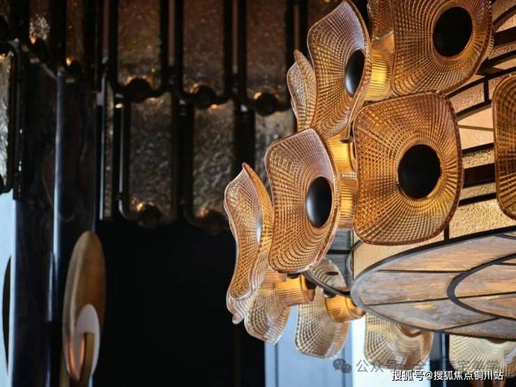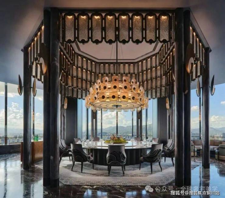 餐厅内设有云端酒吧“潮汐”,焦点落在贝壳造型的中央吧台。吧台垂挂珍珠式样吊灯,增添灵动优雅的气息,而吧台本身采用氧化铜材,随光线变化呈现出流动的金属纹理,如同瓯江波光粼粼,夕阳下更是闪烁金色光辉,宛如温州的自然与文化交融于空间设计之中。