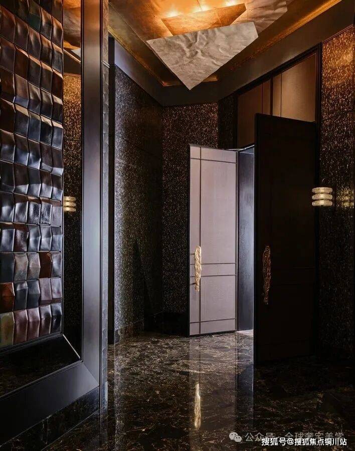 作为百工之乡的温州,其传统工艺嵌螺技艺精美绝伦。通往包厢的走廊设计别具巧思,墙面分别以七彩瓯陶和闪耀着金银光芒的“温州螺钿”装饰,低调中透出华丽,营造出沉稳大气的迎宾气氛。