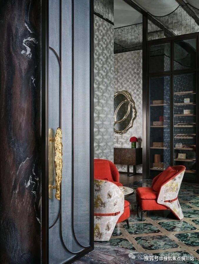 仰望天花顶部,温州另一项非物质文化遗产——山茶花图案,以精湛的瓯绣工艺栩栩如生地展现于立体弧形天顶上。缎面为底,彩丝绣之,细腻花纹与地面绵延起伏、宛如山川脉络的云石相互呼应,既展现了江南的细腻柔美,又彰显了传统工艺的卓越与当代设计的和谐统一。