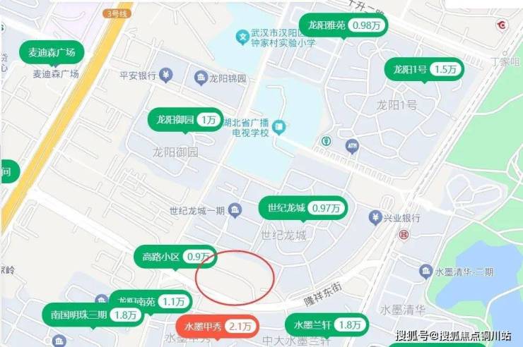 2、与周边二手房价格对比,项目南向是两个别墅区,价格较高;北面世纪龙城房龄较老,均价不到1万;次新房龙阳1号的价格是相对较高的,均价1.5万,也有挂1.1-1.3万的。