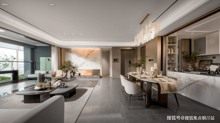 样板间充满细节巧思,比如“岛台社交化”厨房,让厨房客厅融为一体,成为更大的社交会客延伸区域;“酒店套房化”主卧,让业主有更从容的起居空间。