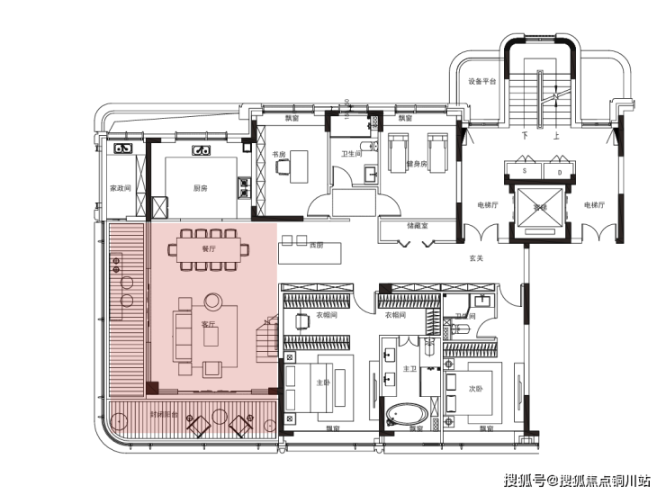 下面,是项目约231㎡四房两厅的平层标准层户型图。为了方便大家理解何为「全景舱」,我特意用红底标注——