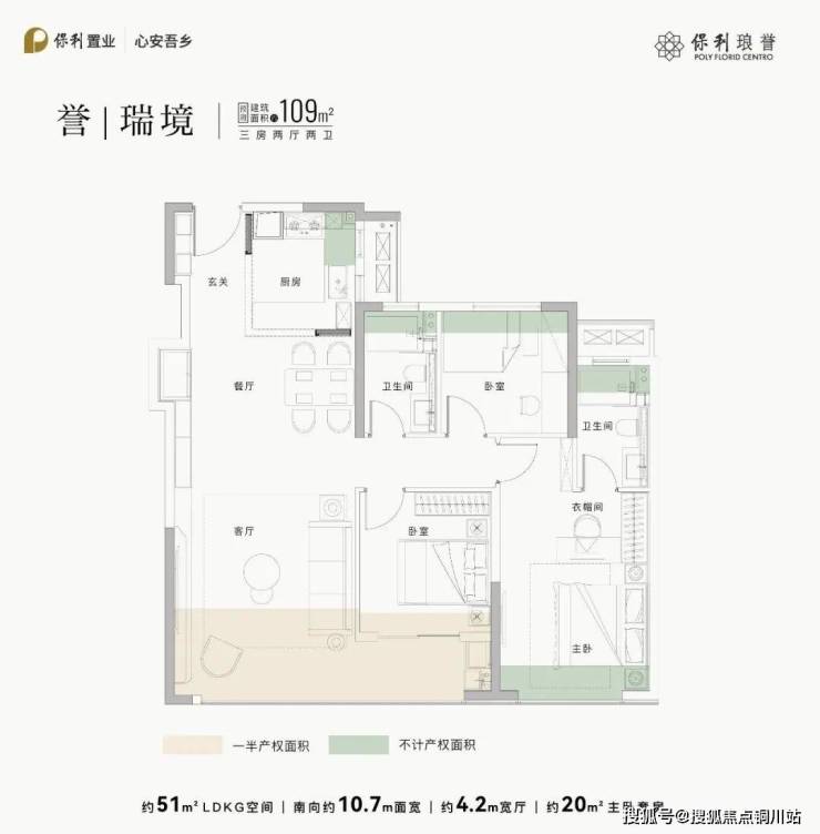 这是琅誉建面约109平的三房两卫户型,尽管是琅誉最小的面积段,其LDKG一体化空间依然超过了50平,主卧套房也达约20平。