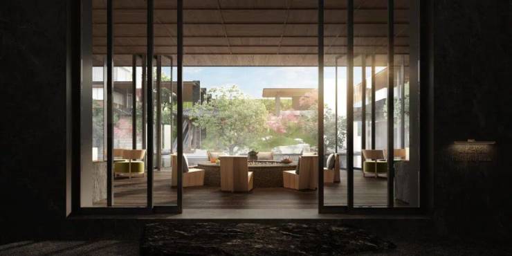 【心流盒子】:整个茶室空间由木材质进行包裹,天花木格栅造型延伸至墙面,打造出立于庭院旁的独特“木质盒子”。推开茶室折叠门,中心庭院的景观一览无余,示范区旖旎风光亦能尽收眼底。