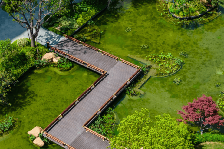 双重水循环系统,保证水质清澈,营造健康生态环境,同时,在水系中种植荷花、睡莲等水生植物,吸引鸟类和昆虫,用大自然的力量来自然实现生态平衡。