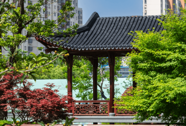 六角凉亭与茶轩以国粹榫卯工艺打造,再现古韵情调,成为园区点睛之笔。