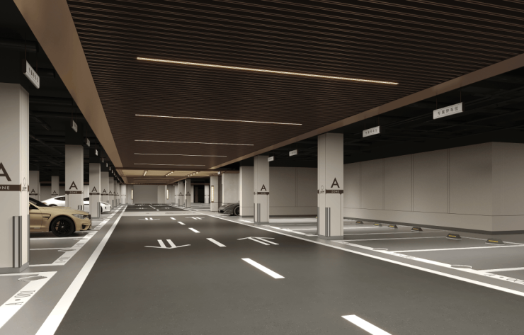 坡道采用高强度马蹄石质感铺装,主车道采用金刚砂耐磨地面铝格栅吊顶,异常奢华,并且整个车库拥有LED智能照明系统,以达到更好的视觉效果。
