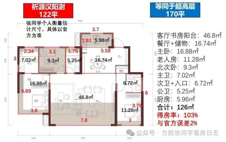 最后是122平户型,四房三卫边户,我预估的套内126平,得房率103%,唯一比官方宣传还低的,有点奇怪,考虑这个户型的最好等到样板间或实体楼出来再说。套内面积等同于之前超高层170平。
