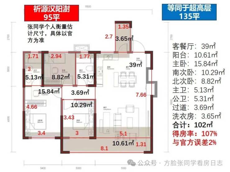 然后是95平户型,3.5房中间户,我预估的套内102平,得房率107%,略高于官方宣传,误差算合理范围内。套内面积等同于之前超高层135平。
