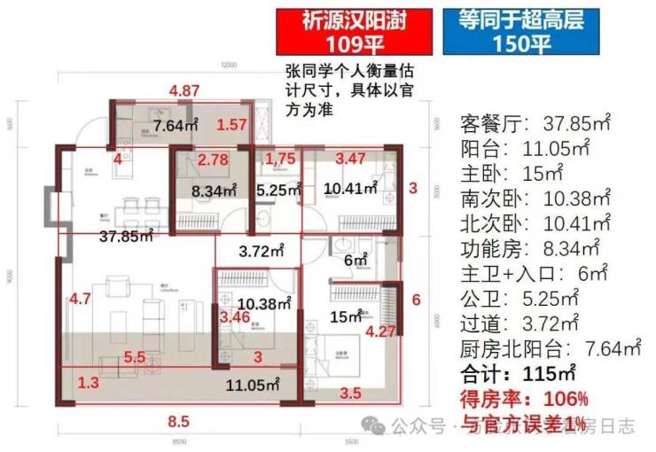 再是109平户型,4.5房边户,我预估的套内115平,得房率106%,与官方宣传105%基本一致。套内面积等同于之前超高层150平。