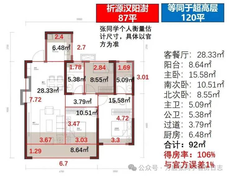 首先是87平户型,标准三房两卫,中间户,我预估的套内92平、得房率106%,与官方宣传105%基本一致。套内面积等同于之前超高层120平。