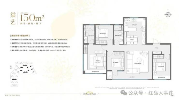 150㎡作为主力户型,近15米的南向开间,配置四房两厅两卫,书房、保姆间等一步到位,满足二胎甚至三代同堂家庭的需求。