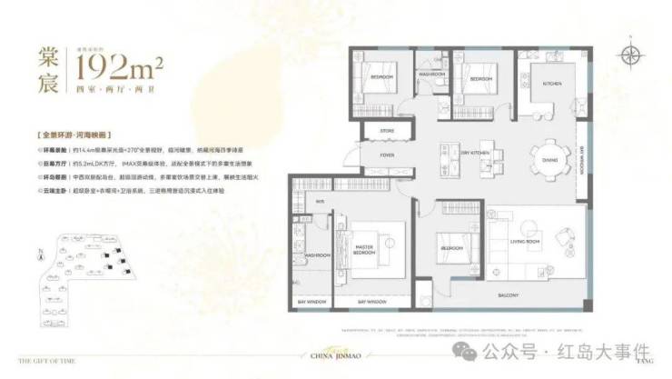 192㎡终极改善户型,四房两厅两卫的设计,南北双套房,客厅拥有270度景观视野,整个胶州湾的美景尽收眼底。