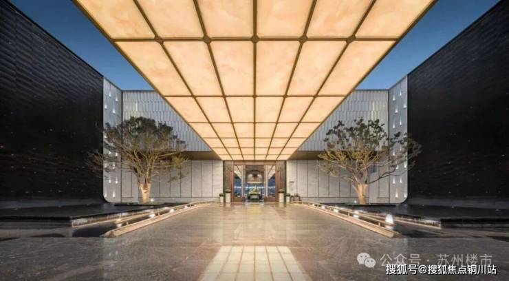 进门就是约500㎡双瀑迎宾序厅,以10米高安哥拉黑石材打造双瀑环抱水景,搭配20米光廊与对称种植特选铁冬青,藏风聚气。