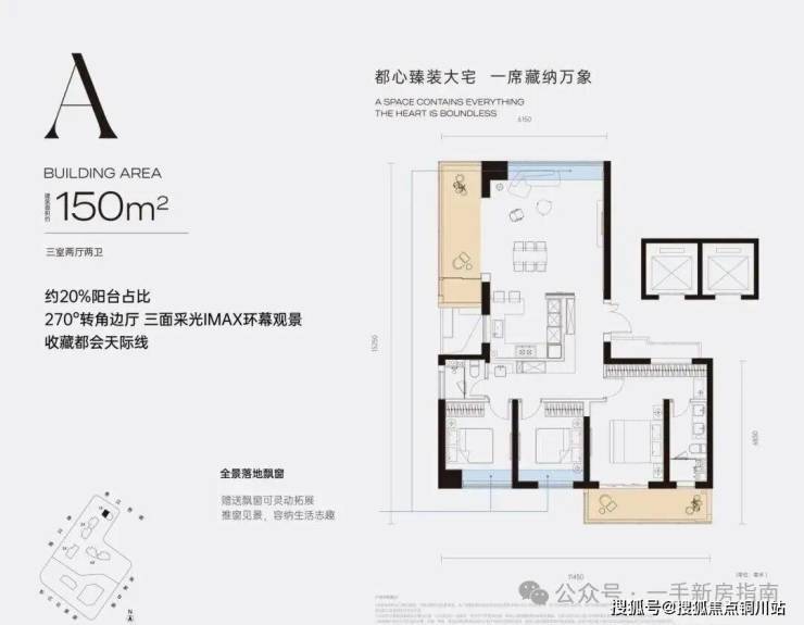 A户型150㎡三房:入户独立玄关,动静分区;北侧休闲活动区,厨房-餐厅-客厅相连对接景观大阳台。