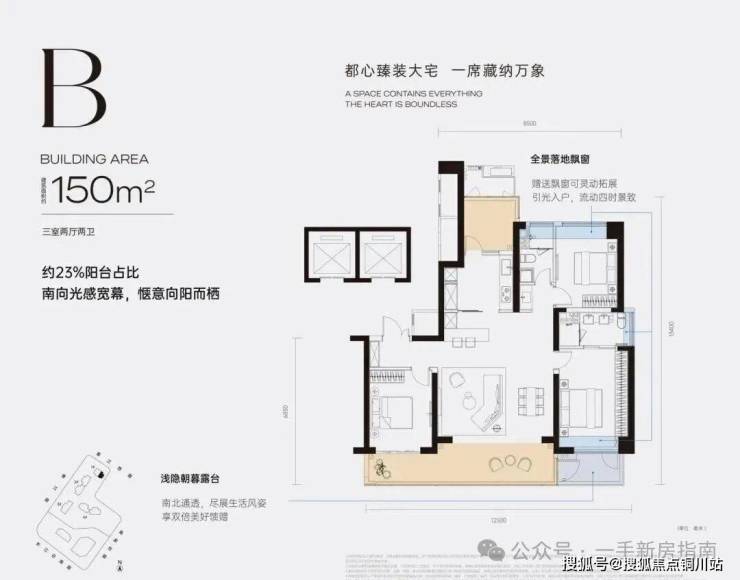B户型150㎡三房:,南侧双开门大阳台直通次卧和客厅,采光通透性好;朝南主卧带独立衣帽间和卫生间