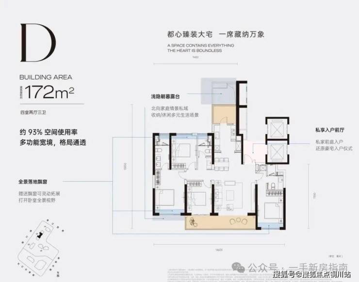 D户型172㎡四房:四开间朝南,三卫设计;主次卧带飘窗;南侧阳台直通客厅和次卧。