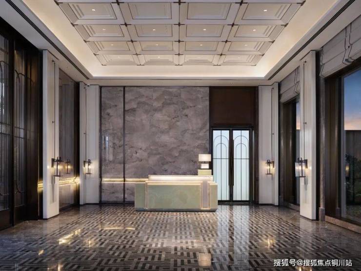 项目大堂采用烟雨江南奢石打造前台背景墙,地面运用拼花水刀切割工艺,质感堪比顶豪项目。