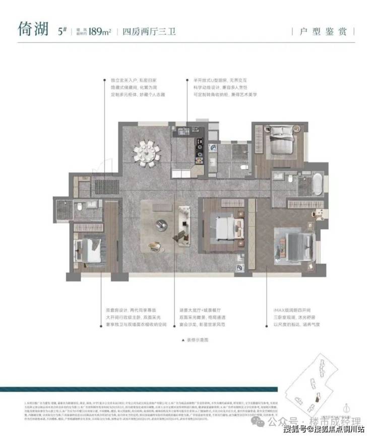 传承东方文化礼序,汲取《春江花月夜》与《四景山水图·春》等传世诗画名篇灵感,设计“三进门仪,园林九景”。一进高门大院,无雨迎宾;二进望湖水庭,游弋诗情;三进古树茶庭,漫步画境。同时融汇五庭四院,形成全围合式布局,呈现集诗意东方美学与当代人居审美需求于一体的中式高端园境,真正做到“内得东方山水,外望大江大湖”。