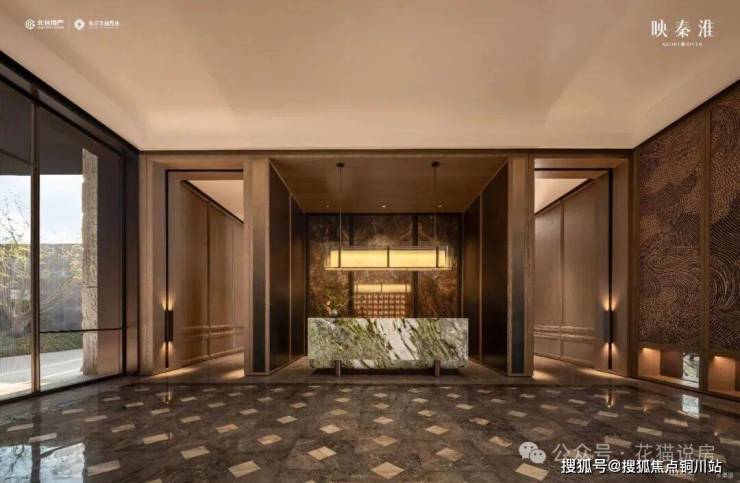 它的设计灵感源自南京六朝古都的礼制文化“一进登门望府,二进穿庭入画”,约百米宽、7米高的超常规尺度主入口, 扩大了整个楼盘的封面, 它的用材尽显奢侈——