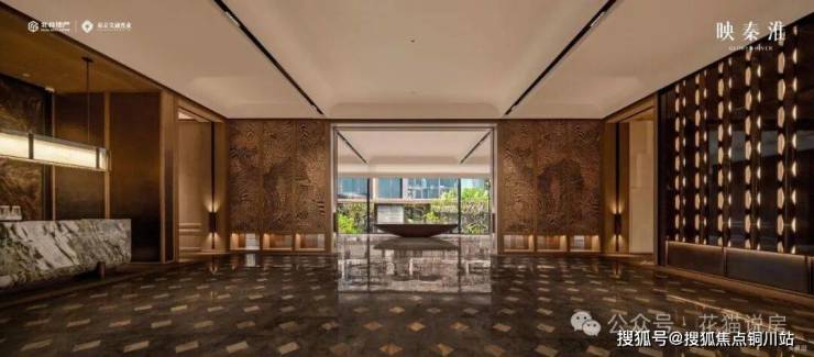 顶部是定制化的造型立体铝板,对景景墙是百万级的马达加斯加矿源的蓝翡翠奢石,穹顶下方是安哥拉黑液态大理石,中间是宝格丽酒店同款环岛落客区,营造了气势撼人的归家尊崇仪式感。