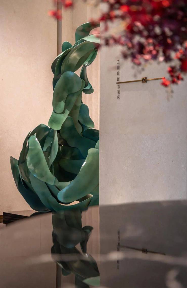 在这座会所中,即便是随意驻足,却总能觅见一份“高级审美”。廊道两端、转角、甚至任何一个不经意的地方,都被铺装上了巨幅艺术挂画、青绿山水、花布印染或是青瓷风格雕塑……