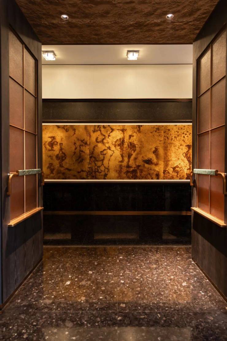 奢阔门廊的照壁与穹顶,是由超50万块格栅手工拼接而成,同时选用了宁波红帮裁缝技艺中的绢丝,在格栅背部打造上海璞丽酒店同款的绢丝玻璃。