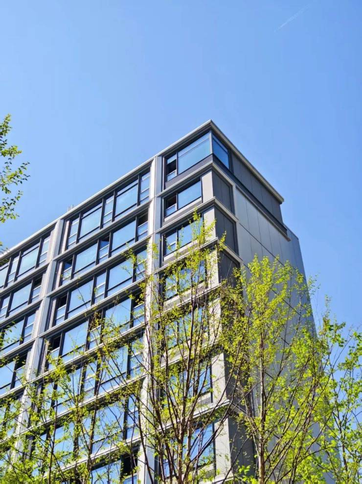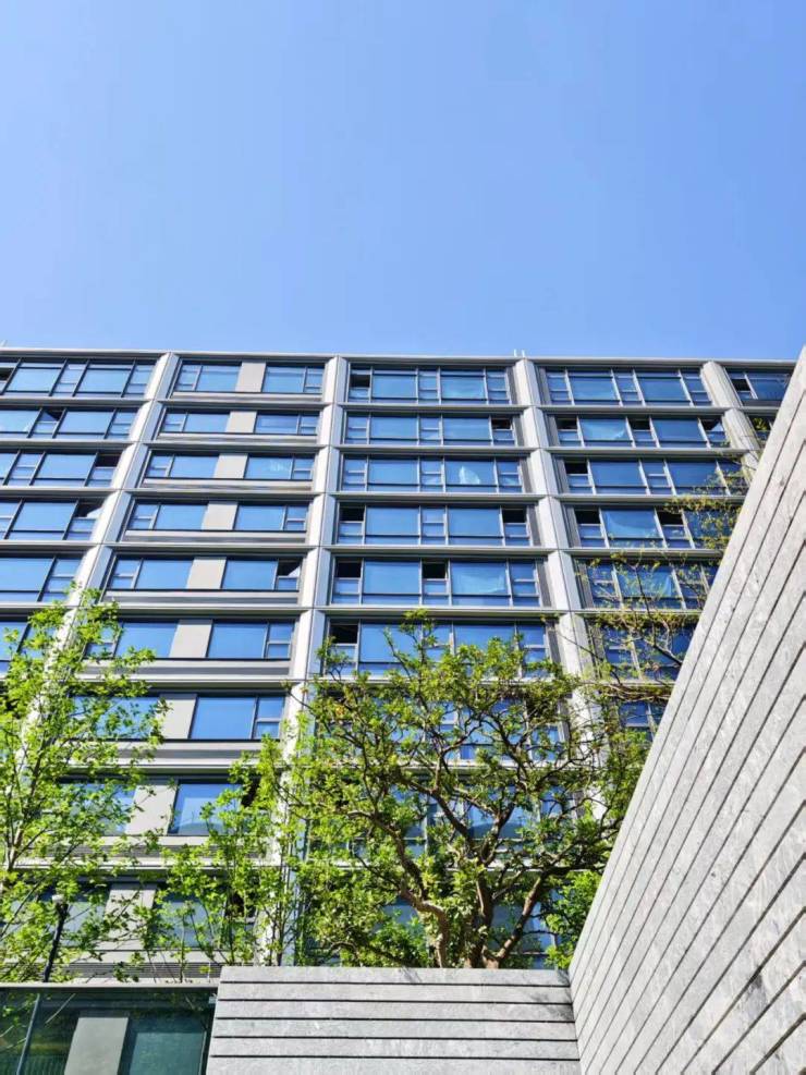 外立面是大面积的玻璃和干挂铝板,在阳光下闪闪发光,很好看。