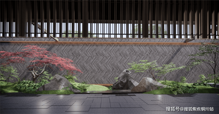 再通过整面大片的落地玻璃,将二进庭院的廊庑、池水、禅庭雨幕等景观全部框进来,坐在售楼处中就可以享受到山水和鸣的美好。