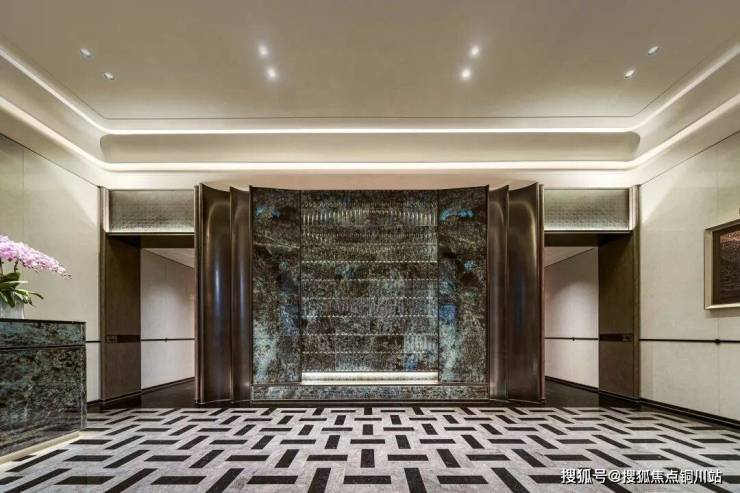 入户大堂的地面高成本地采用卡塔尔灰石材,且用两种石材拼花铺设,深浅灰色交织,秩序却不呆板,精致却不刻意。