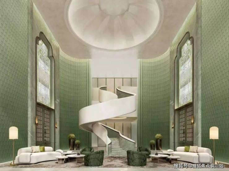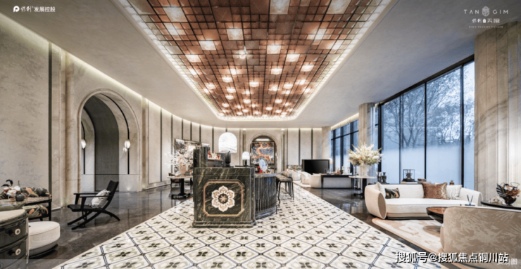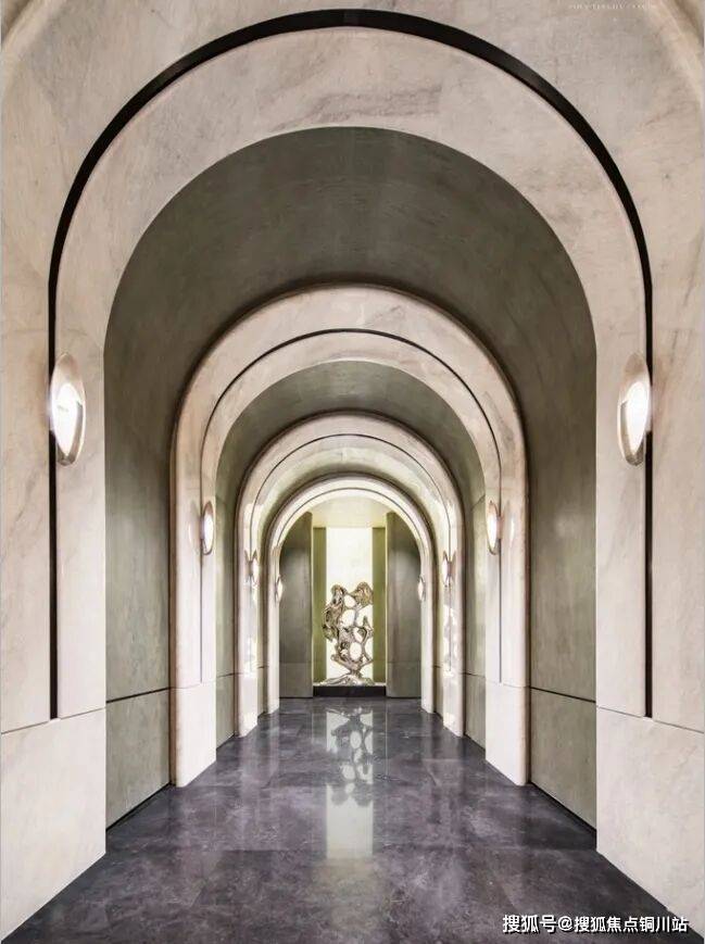 社区归家大堂名曰维海厅,维海厅设计灵感源于三岔河口,顶部灯饰造型的琉璃羽翼层叠如帆影,灯光投射地面,形成“波光粼粼”的动态效果,维・庆堂融合了庆王府刺绣、地面设计灵感取材于天津市花月季花,这中间的叠级的拱门则像极了民园体育馆的观感,令天津人亲切感倍增。
