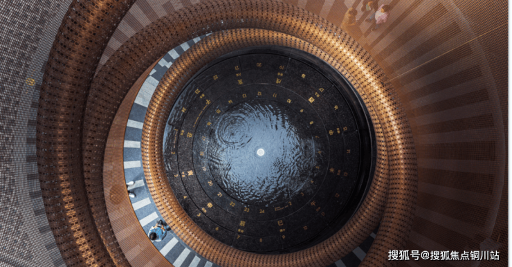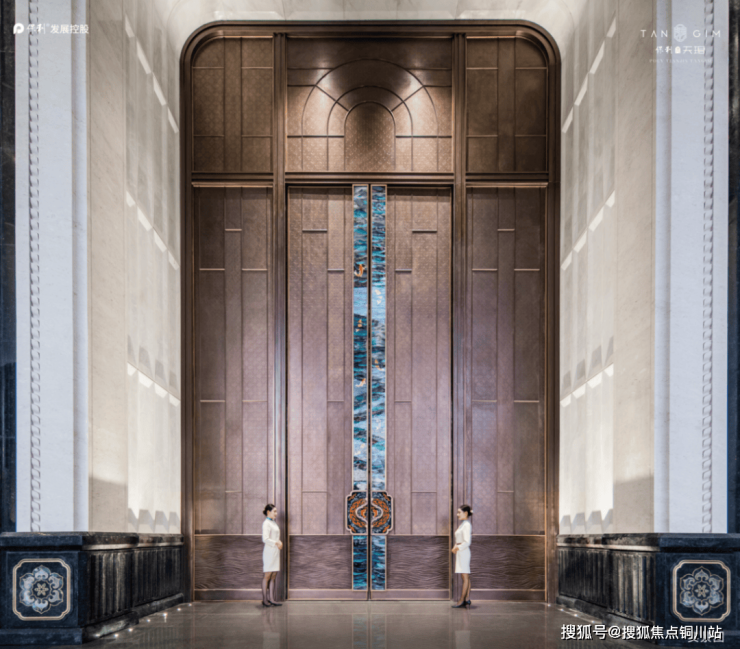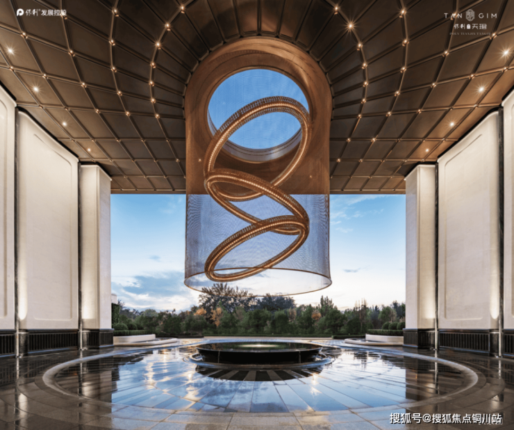 项目光之门的顶部设计形制来源于皇家华盖,将中国古式的藻井与西式的星光穹顶相结合,外部包裹的金属网,由3 万个金属环组成,由匠人师傅手工镶嵌而成,底部涌泉底座由奢石整体切割而成,雕刻了中国传统 12 个时辰以上下呼应,寓意幸福时光永恒。