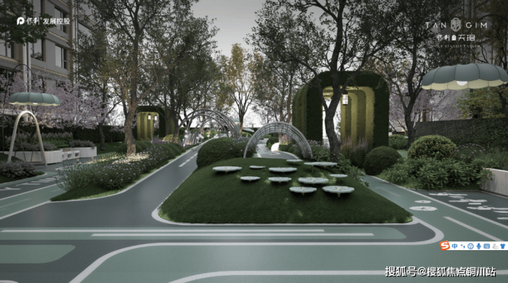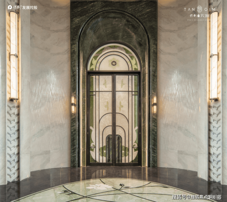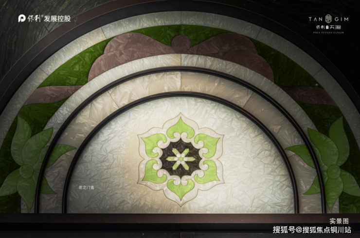 津门天珺社区的超级符号为中国传统纹样宝相花纹,在整个社区内,门楣、墙体、顶面、地面、景观等空间,宝相花纹的设计贯穿了整个社区,寓意幸福圆满吉祥如意。