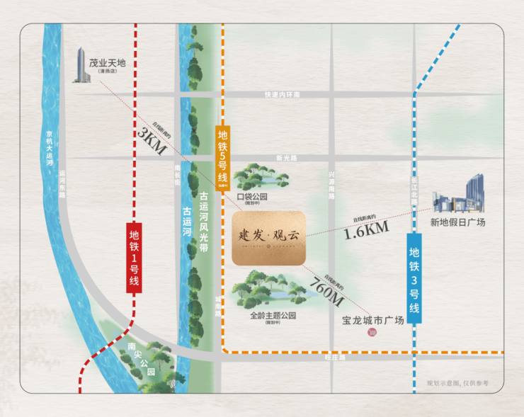 【高颜生态】一步古运河风光带,咫尺全龄主题公园(规划中)、口袋公园(规划中),距9.7万方南尖公园约800m(直线距离)
