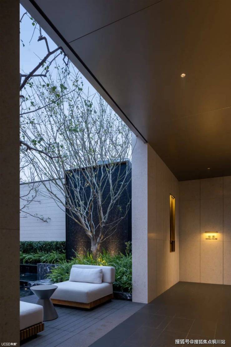 穿过接待前厅进入静心庭院。墙面围合,形成安静隔绝却又开放的私密空间。第二个庭院以动中有静、移步换景的苏式游园场景来布置空间格局。庭院、叠水、奢石、坐凳共同组合而成一个纯粹又自然的度假感现代庭园。