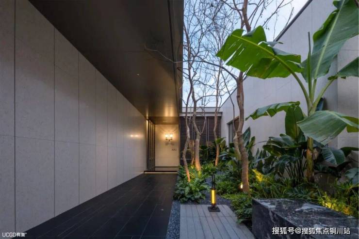 最后一个廊道小院抛开了厚重与复杂的设计,璞拾胥江延续“拾系”作品的白加金色调,融合自然的绿色和天光,打造出简洁又不失美感的建筑空间。 一条绿荫长廊,营造曲径通幽之效。公共与私密相连,直达样板间区域。