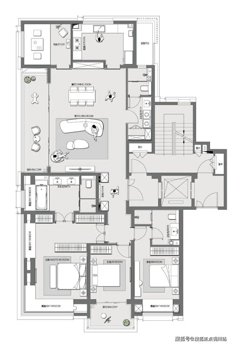 建面约186平方米户型,整体做到了完全的动静分区,设计成双套房+次卧+书房的配置。主卧总统式套房,进门双开门+主卫双开门。出于西侧观景是京杭大运河的考虑,创新性地设置了吸睛的双面 270度全景大飘窗,让窗外干年古城与运河风光尽收眼底。