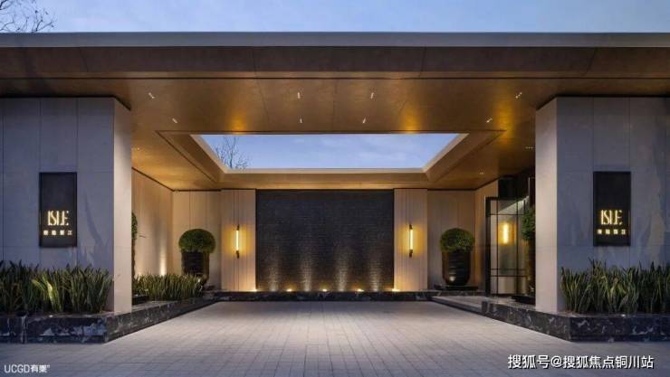 入口前庭是度假式生活的起点。璞拾胥江入口处的转角景墙仿佛一卷画卷,把嘈杂与喧嚣隔绝在外,营造出了尊享街区的领域氛围。第一个入口庭院引入了天光,将四方前庭打造成奢华又隐秘的酒店式入口。