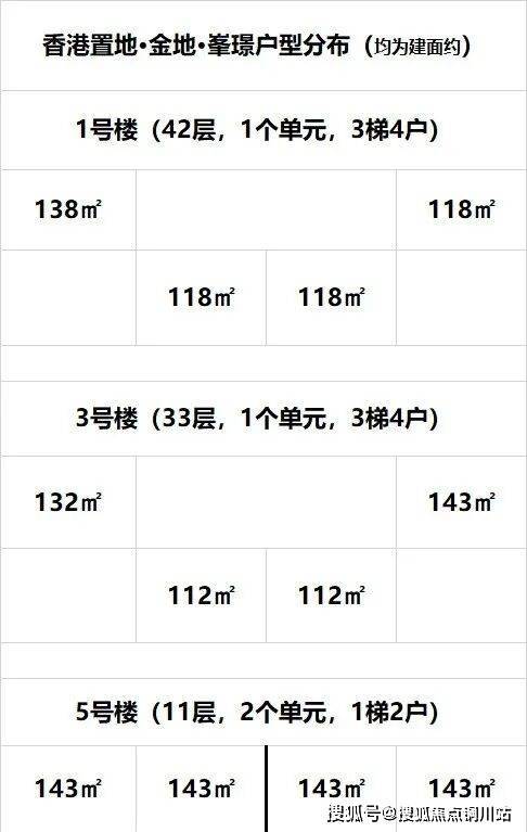 1号楼为42层、1个单元、3梯4户;3号楼为33层、1个单元、3梯4户;5号楼为11层、2个单元、1梯2户。