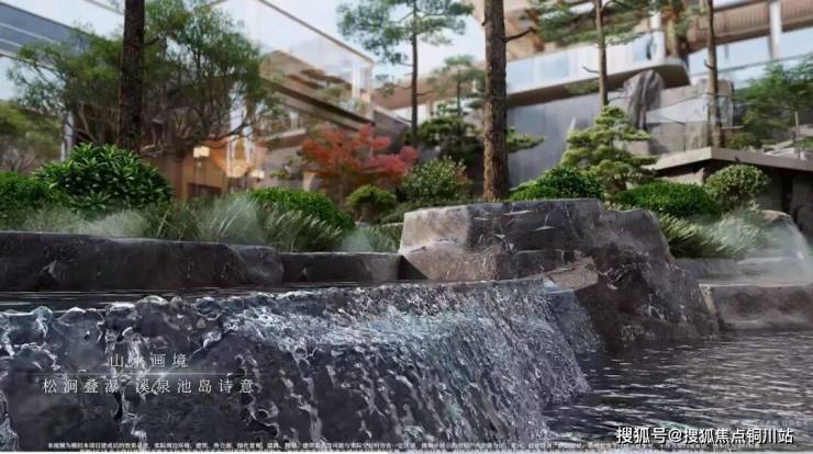 绿城在庭院里还藏了一个流水跌瀑,用拙朴的老皮石模拟天然的崖壁,加上山石错落叠放,水瀑落下,飞珠溅起,有种“断山疑画障,悬溜泻鸣琴。”的意境。