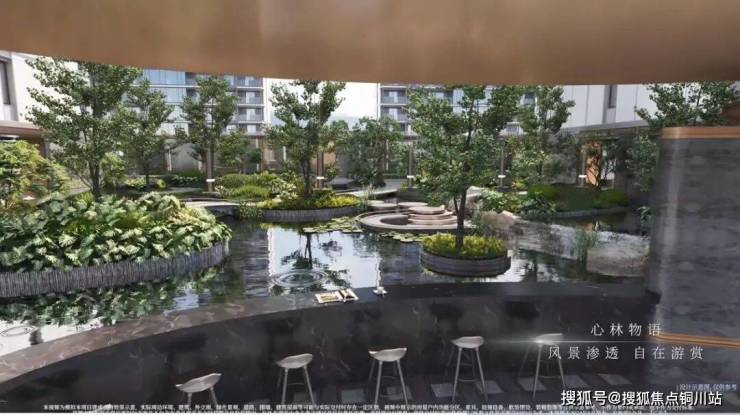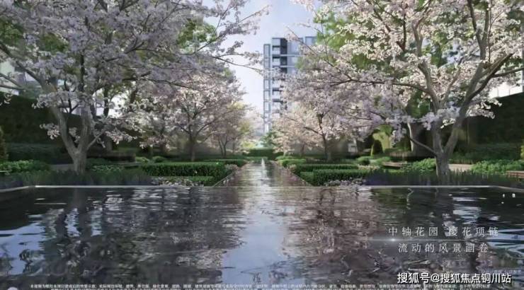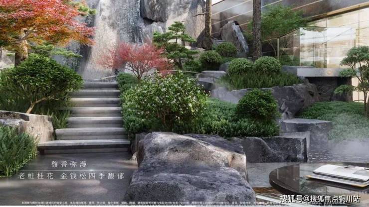 从馥香园主入口的中心水瀑,再到下沉庭院的岩涧弥香,随后到拥有“心林物语”IP的约580平水景花园,通过阳光草坪,就是中轴艺术花园,镜面水景下,两侧浪漫樱花树阵,最后来到次入口,一方枯山水庭院,有种无水胜有水的意境。