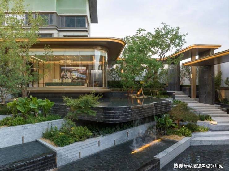 穿过铜门,进入接待大厅,透过一片落地玻璃窗,一幅园林画卷徐徐展开——叠水佳石、立体游廊,曲折尽致,颇具园林逸趣。