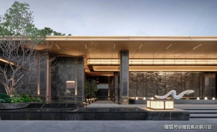 主入口空间向内退让,形成有温度的城市边界。52m超长门头水平横向舒展,既遵循中轴对称的传统礼仪范式,又以简约线条、奢华材质与极致工艺呈现艺术、轻盈的雅奢格调。前场庭院以“洄游”为理念,重构“四水归堂”的空间序列。