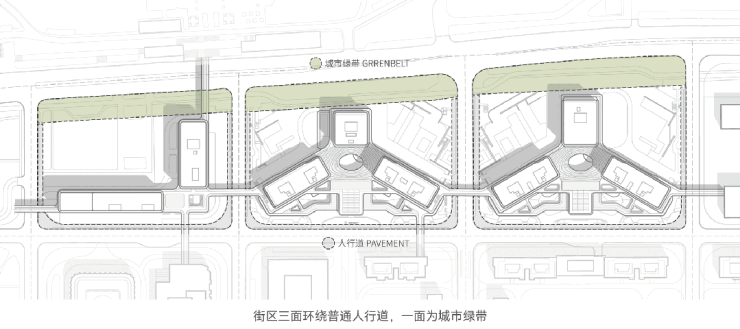 不同于竞赛方案中融入城市网格的布局,业主给定的“双Y形+L形”在横平竖直网格化的城市中呈现出异化的空间结构。我们延续竞赛方案中的立体化分区设计和“生境底盘”概念:近人尺度上,通过尺度优化和空间引导来消解异构布局带来的距离感和疏离感;宏观尺度上,以差异化的建筑形象和高效可达建立城市坐标。“生境底盘”则在其中承担多层级、多流线的枢纽角色,来实现不同业态的交互与不同群体的分流。