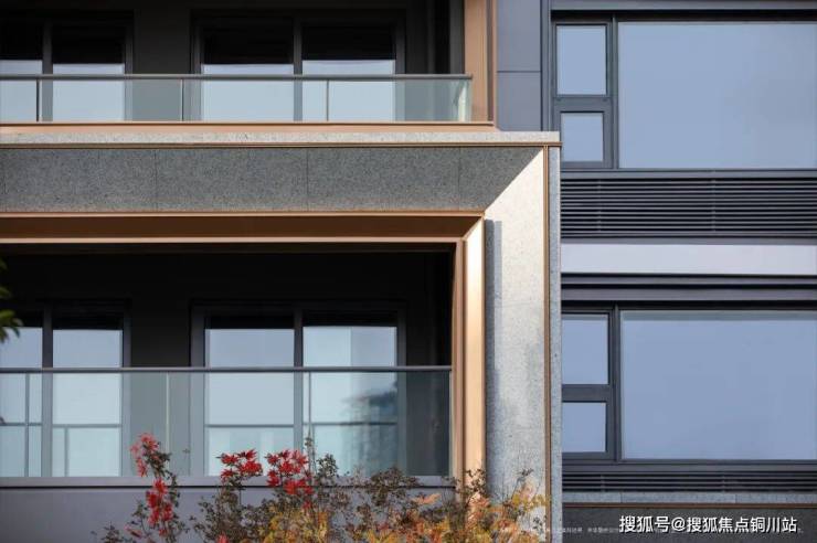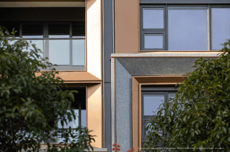 建筑采取自由长窗设计,弱化边框,做到了高窗墙比,部分户型达到约35%窗墙比。部分造型选取斜切约45°金色的铝板型材,外立面更几何、立体。