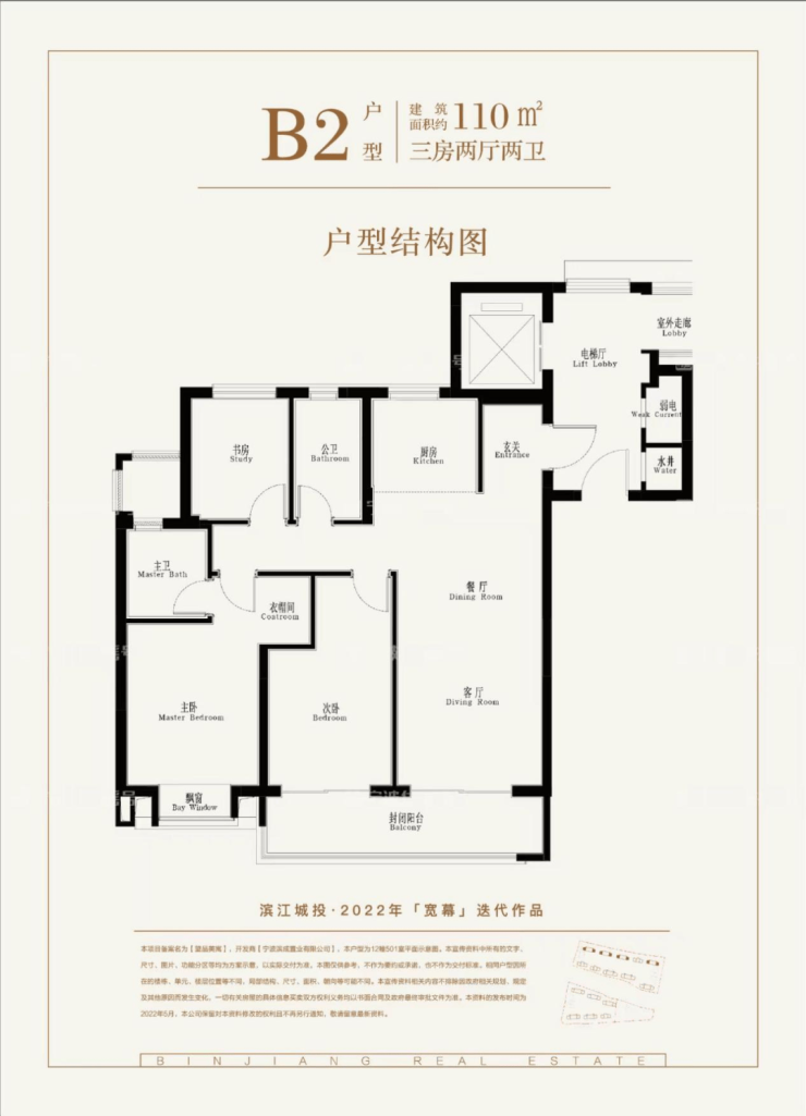 主推户型:建筑面积约110㎡户型,南北通透格局,餐客厅一体化外接超宽尺度阳台;独立玄关提供更多收纳空间;套房式主卧自带景观飘窗,延展生活尺度。