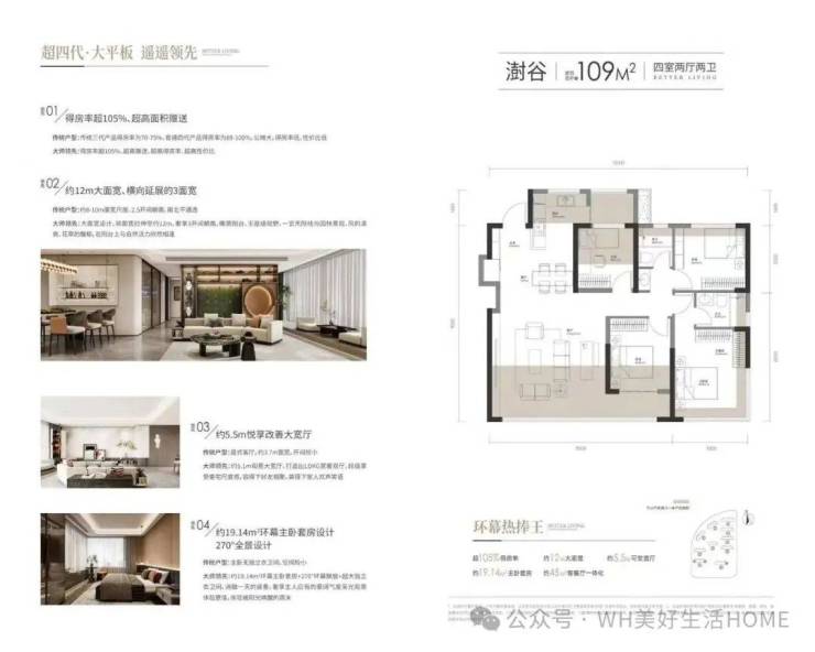 建面约109㎡四房两厅两卫(边户):南北通透设计,三开间朝南配约8.5米南向阳台,L型转角大飘窗增强采光。厨房板块采用独特优化设计,主卧创新实现 双面飘窗+270度拐角飘窗。