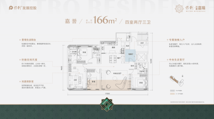 其次,保利约166㎡户型的南向开间约17米,这同样是目前武昌同级别产品设计最优越的