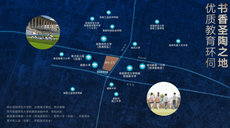 八大商业配套:吾悦广场、清河宋街、宝龙城市广场、万达广场、怡和城市广场、七彩世界欢乐城、大学城红街,阜阳商厦时代广场。